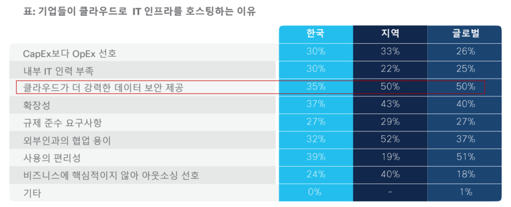 기업들이 클라우드를 선택하는 이유에 대해 조사한 결과입니다. 많이 보셨을 내용인데 눈길을 끄는 항목은 ‘클라우드가 더 강력한 데이터 보안 제공’입니다. 이 항목에 응답한 CISO가 한국은 35%이고 아태지역과 글로벌 평균은 50%네요. 한국의 클라우드 도입률이 글로벌 평균 대비 꽤 떨어진다는 것은 여러 벤더의 자료에서 보셨을텐데 한국 기업들의 CISO는 클라우드 기업의 보안에 대해 글로벌 대비 다소 회의적인 시각을 가지고 있는 것을 알 수 있습니다.