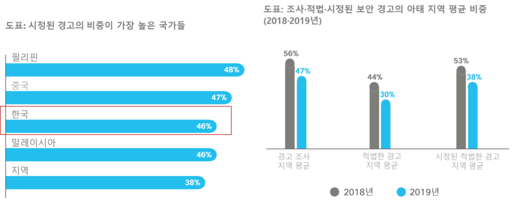 앞서 한국의 경우 수신된 보안 경고들을 시정 조치함에 있어서 글로벌 평균인 43%보다 높은 46%를 기록했다고 말씀드렸습니다. 아시아 태평양 전체 평균은 38%로 한국은 아시아 국가들 중 보안 경고에 대해 잘 조치하고 있는 나라 중 하나입니다.(그만큼 보안 담당자들이 격무에 시달리고 있다고 봐도 되겠죠.)