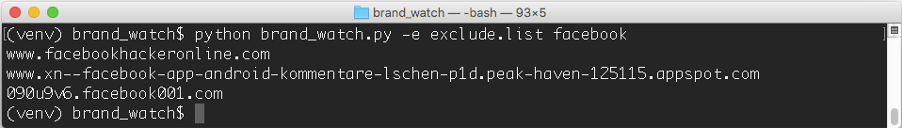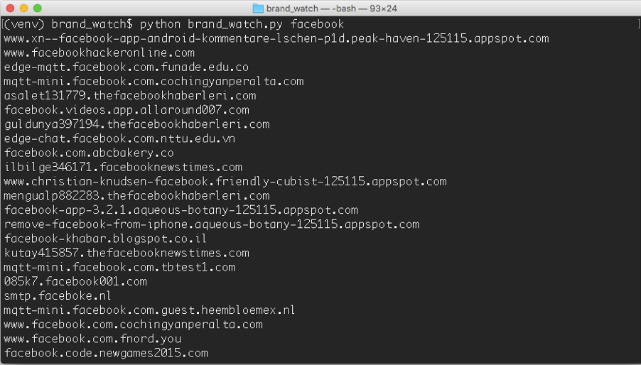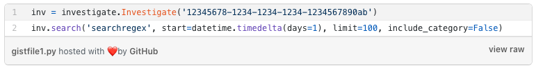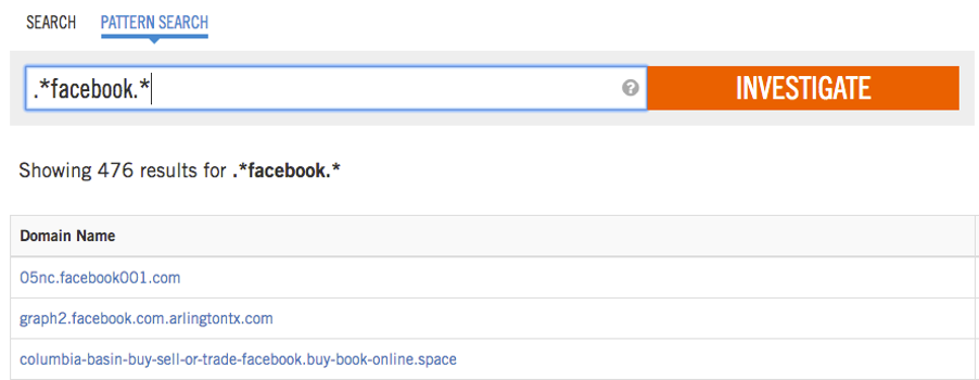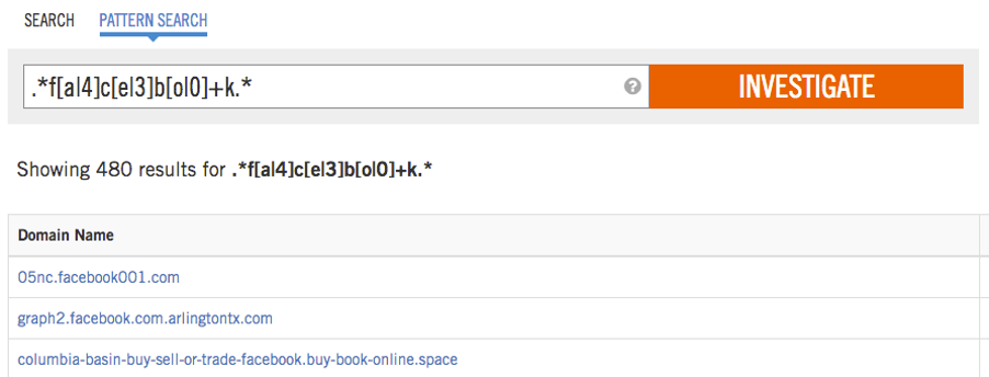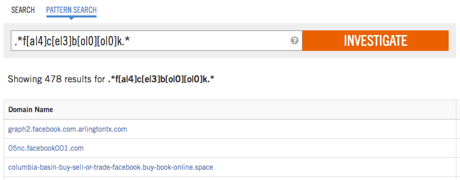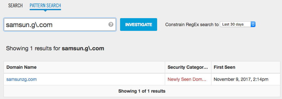 시스코 umbreall의 분류 알고리즘은 훨씬 더 고급 수준에서 이러한 유형의 공격에 대한 광범위한 발견을 자동화 했지만, 관리자들은 여전히 기업의 브랜드에 기본적인 패턴 검색을 주기적으로 할 필요가 있습니다. Cisco Umbrella Investigate API는 이러한 유형의 자동화를 용이하게하는 완벽한 도구이며 pyinvestigate 는 API와 쉽게 연동을 할 수 있습니다. 지난 24 시간 이내의 문자열을 검색하려면 다음와 같이 하실 수 있습니다.