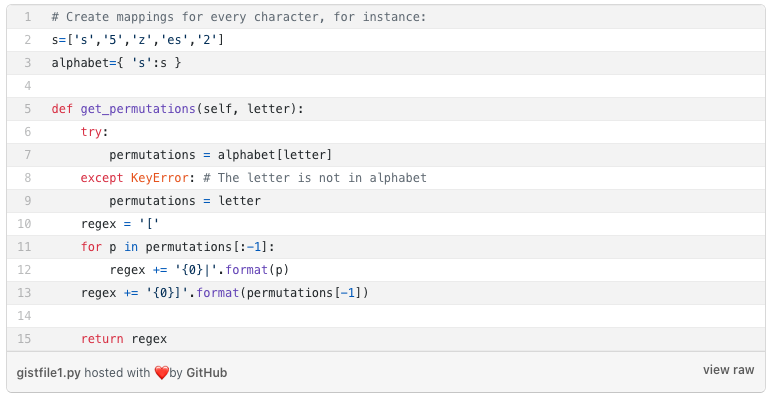 단일 브랜드만 모니터링하는 경우 정적 정규 표현식을 작성하지 않아도 될 수 있습니다. 그러나 많은 브랜드에 대한 검색을 하려면 기본 정규식을 작성해야 합니다. 다음은 브랜드의 각 문자에 대한 정적 매핑을 조회하고 문자 대체 목록을 반환하는 예입니다.