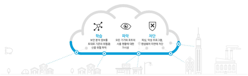 보안 인터넷 게이트웨이인 시스코 엄브렐라는 사용자의 위치에 관계없이 인터넷이 존재하는 위협을 저지할 1차 방어선 역할을 합니다. 엄브렐라는 모든 위치, 장비, 사용자의 인터넷 활동을 완벽하게 파악해 악성 프로그램이 네트워크나 엔드포인트에 도달하기 전에 미리 차단합니다. 클라우드 기반의 개방형 플랫폼인 엄브렐라는 이미 사용 중이던 기존의 보안 솔루션과 원활하게 호환해 기존의 위협과 신종 위협에 대한 위협 분석 정보를 실시간으로 제공합니다.