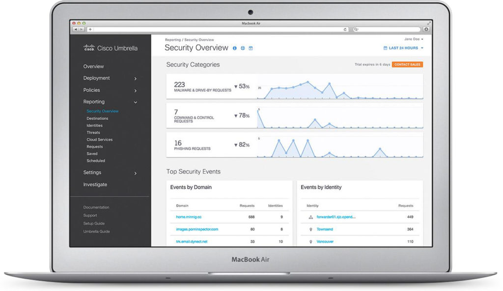 엄브렐라는 단 몇 분만에 설치가 끝납니다. 하드웨어를 설치하거나 소프트웨어를 일일이 업데이트할 필요가 없습니다. 클라우드를 통해 지원하기 때문에 가능한 일이죠. BYOD 및 IoT를 비롯해서 네트워크 연결된 모든 장비를 몇 분 내에 프로비저닝하고 기존 시스코 인프라[AnyConnect, ISR(Integrated Sevices Router) 4K 시리즈, 무선 LAN 컨트롤러 5520 및 8540]를 사용해 수천 개의 네트워크 엔드포인트와 로밍 노트북을 빠른 시간 내에 프로비저닝 할 수 있습니다.