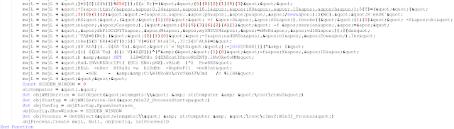 마지막으로 다운로드된 페이로드를 실행하기 위해 WMI를 사용하는 등 더욱 난독화된 버전이 있습니다.