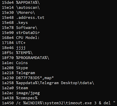 모든 계층이 언패킹되고 나면 AZORult가 마지막 페이로드가 됩니다. 최종 바이너리에서 이 탈취 악성 코드의 악의적인 문자열을 확인할 수 있습니다.