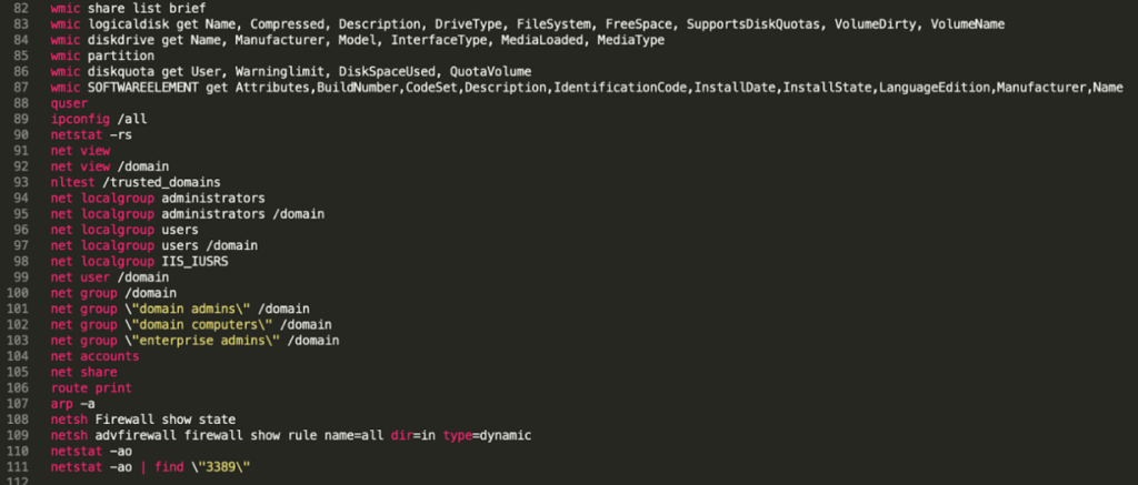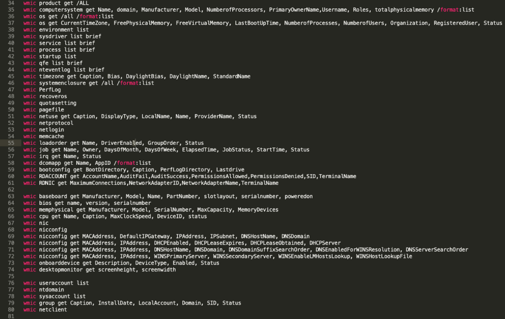 공격자는 날짜, 시간, 드라이버 같은 정보를 검색합니다. 이를 통해 시스템, 패치 수준, 프로세서 수, 네트워크 구성, 하드웨어, 펌웨어 버전, 도메인 컨트롤러, 관리자 이름, 계정 목록 등에 대한 정보를 볼 수 있습니다. 이렇게 시스템과 관련해 엄청난 양의 정보가 수집되기 때문에 공격자는 추가 공격을 감행하기 위한 만반의 준비를 할 수 있습니다. 공격자는 WMI를 사용해 화면 크기까지 파악할 수 있습니다. 이는 시스템이 샌드박스인지 아닌지 식별하기 위한 트릭일 수 있습니다.