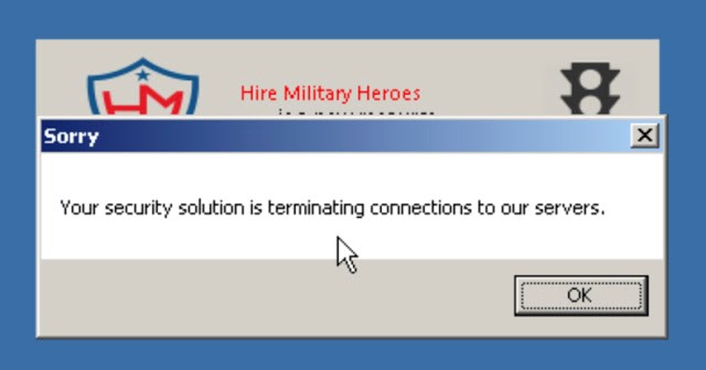 “Hire Military Heroes”이라는 가짜 웹사이트(hxxp://hiremilitaryheroes[.]com/)는 “아버지의 깃발(Flags of our Fathers)”이라는 영화의 이미지를 가져와서 퇴역 군인을 위한 사이트인 것처럼 사칭하고 있습니다.