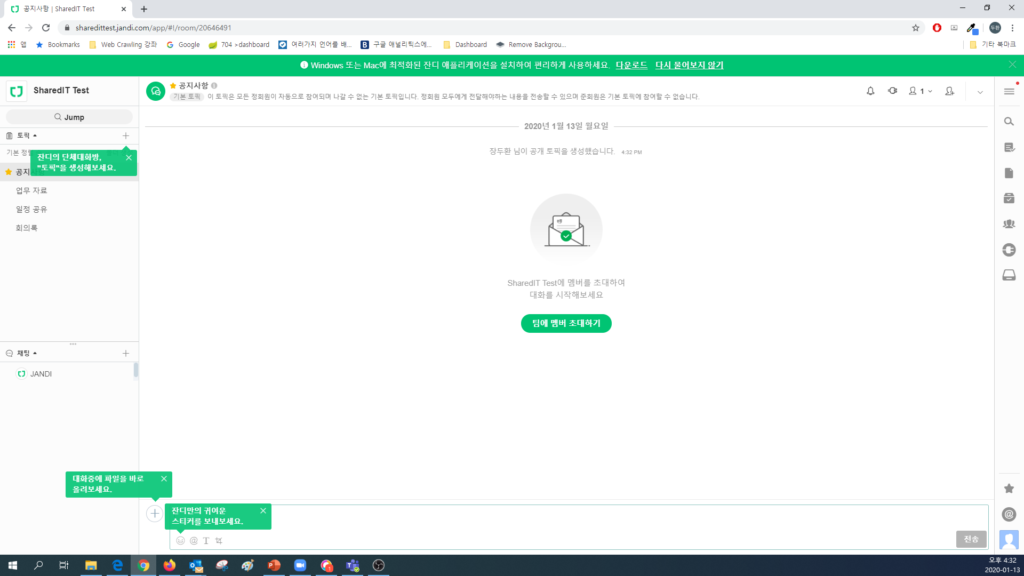 처음 클라이언트에 접속하면 최소한의 사용자 가이드가 제공됩니다. JANDI는 화상회의가 아닌 채팅이 주력인 솔루션이다보니 카카오톡에 익숙한 국내 사용자들이 큰 어려움없이 사용할 수 있을 것이라고 생각했나 봅니다. 물론 메신저 기능 자체는 큰 어려움이 없지만 기업에서 사용하기 위한 협업 도구로써의 다양한 기능들이 존재하기 때문에 좀 더 자세한 가이드를 제공하는 것이 좋겠다는 생각이 드는군요. 물론 도움말 메뉴에서 별도의 튜토리얼을 제공하고 있지만 외부에 노출되어 있지 않고 우측 상단의 세줄 아이콘을 클릭해서 진입해야 하는 불편함은 아쉬웠습니다.