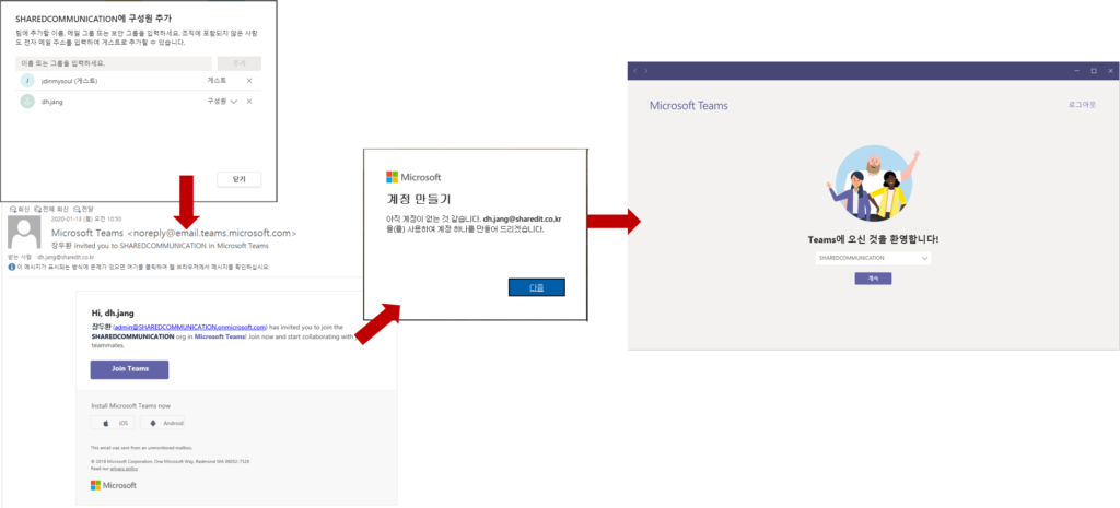Microsoft Teams 역시 구성원(멤버)를 추가해 초대메일을 발송하는 과정은 간단 했습니다. 그런데 초대메일 에서 참여 버튼을 누르면 Microsoft 계정을 만들어야 했습니다. 이미 Microsoft에 등록된 계정이라면 이 과정이 생략되겠지만 제가 사용한 이메일주소는 그렇지 않았기에 이메일주소를 Microsoft 계정으로 등록하는 과정이 필요했습니다. 때문에 초대 -> 메일 확인 -> Microsoft 계정 생성(회원가입 프로세스) -> 참여의 단계를 거쳐야 했고 Microsoft 계정 생성 단계 하나가 나머지 세 단계보다 더 오래 걸렸네요.