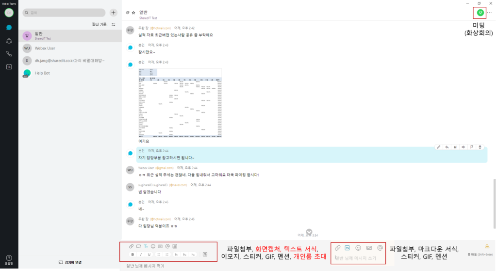 Cisco Webex Teams는 좌측 순서대로 메인 기능, 멤버, 채팅화면 순서로 UI가 구성되었습니다. 채팅창에는 자료 공유(파일첨부, 화면캡처), 텍스트 서식을 비롯해 메세지에 다양한 개성을 입히기 위한 부가 기능들(이모지, 스티커, GIF)이 있었고 최근 채팅 솔루션들 중 이 기능이 없는 것은 찾아보기 어려울 정도로 기본 기능이 된 멘션과 1:1 대화를 위한 개인룸 초대 기능을 제공하고 있습니다. 특이한 것은 데스크탑 앱 버전과 웹 버전에서 제공하는 기능에 차이가 있었고요. 빨간색으로 표시한 기능이 데스크탑 앱 에서만 제공하는 기능입니다.