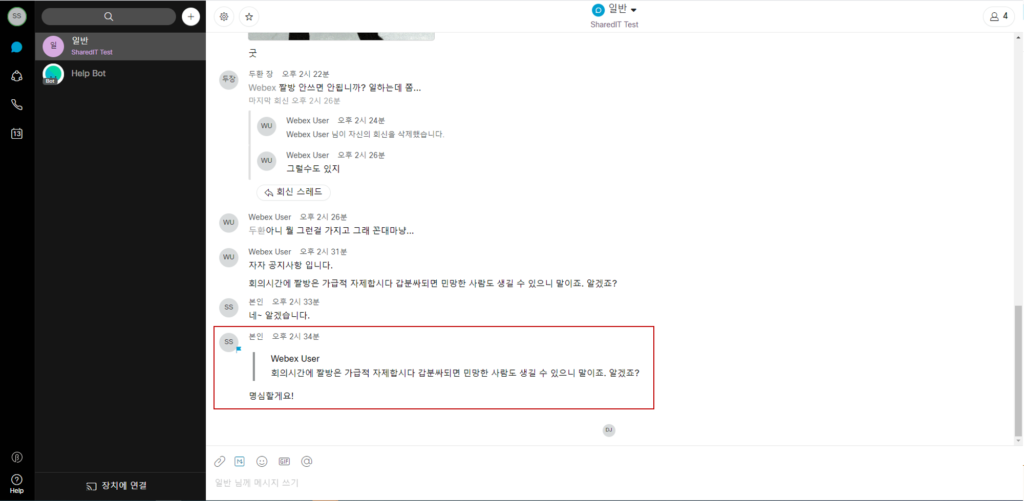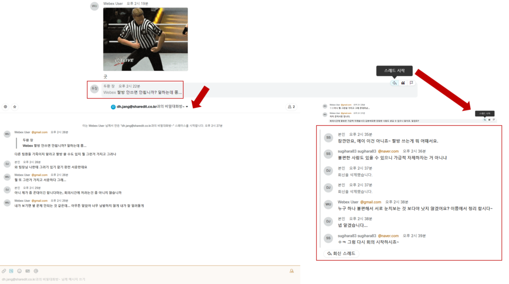 Cisco Webex Teams는 글로벌 솔루션이다 보니 스레드 형태를 지원하고 있습니다. 그래서 위와 같이 짤방을 쓰지 말자는 주제에 대해 채팅창을 벗어나지 않고 대화를 이어나갈 수 있고요. 참여하려면 해당 스레드 하단에 있는 ‘회신 스레드’에 채팅을 하면 됩니다.