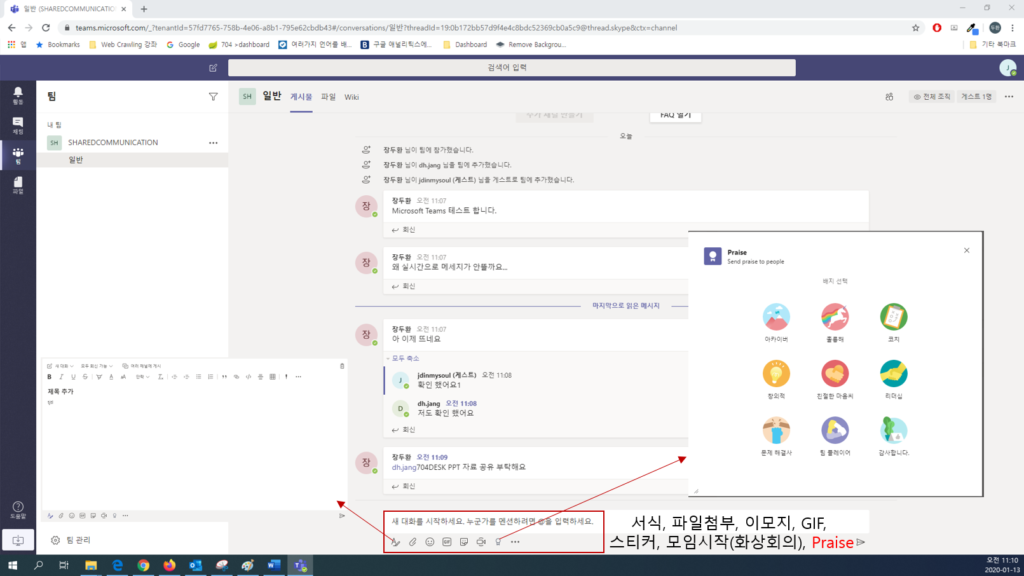Microsoft Teams의 채팅 UI는 Cisco Webex Teams와 유사한데 좀 더 미려한 UI라고 보여집니다. Webex Teams와 유사한 채팅 기능들을 제공하고 있으며 채팅 창에 모임시작(화상회의) 버튼이 있어 멤버들과 미팅을 시작할 수 있고요. 특이한 것은 Praise라는 기능인데 마치 ‘참 잘했어요’ 도장처럼 대화를 이어나가는 도중에 사용하여 상대방을 치켜세워줄 수 있습니다. 업무를 잘 끝낸 팀원에게 팀장이 ‘수고했어요’라는 밋밋한 문장 보다는 ‘훌륭해’라는 Praise를 달고 ‘수고했어요’라고 하는 것의 차이라고 볼 수 있겠네요. 받아들이는 사람 입장에서는 후자쪽이 훨씬 기분이 좋지 않을까요?