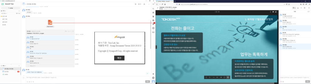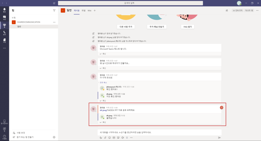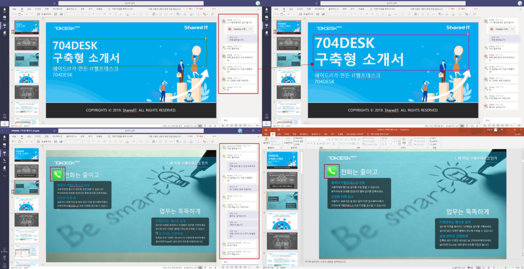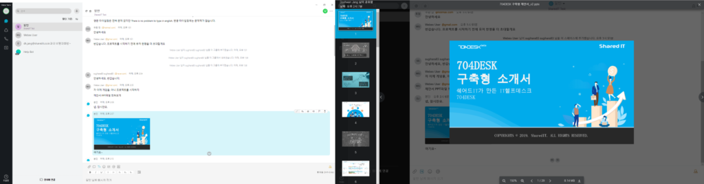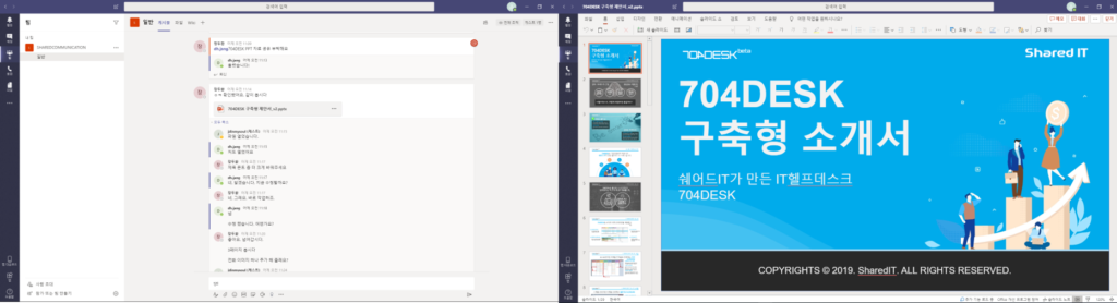 그리고 PPT파일이 공유된 스레드를 미리보기 우측으로 가져와 대화를 이어나갈 수 있습니다. Microsoft Teams처럼 PPT파일만의 스레드가 아니고 공동편집도 불가능 한 것은 아쉬웠네요.
