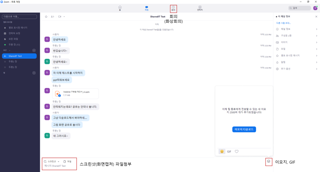 Zoom의 채팅 UI는 심플해도 너무 심플합니다. 주력이 화상회의다 보니 그럴 수도 있는데, 앞서 보셨던 두 회사의 솔루션 대비 지원하는 기능이 매우 빈약합니다. 심지어 멘션도 없…는 줄 알았는데 @를 누르면 대화창에 멘션할 수 있는 멤버 리스트가 나타나고 거기서 누르거나 바로 타이핑해서 멘션을 하면 됩니다. 스레드 기능 역시 ‘회신’이라는 명칭으로 제공되나 대화 문장에 마우스를 가져가야 관련 아이콘이 나타나고요. 이모지와 GIF, 스티커도 제공합니다. 보여지는 것이 단순할 뿐 기본 채팅 기능은 다 제공하고 있긴 합니다.