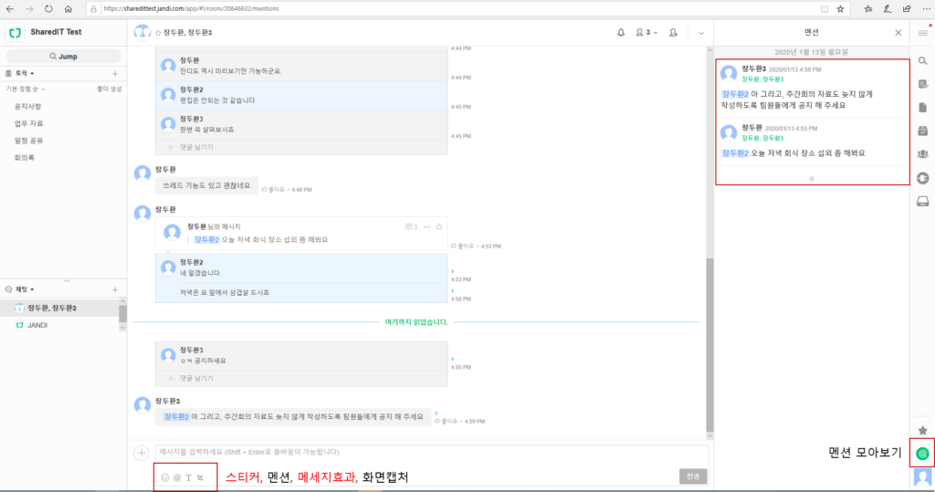 채팅의 경우 여타 다른 솔루션들과 크게 다르지 않은 기능들을 제공하고 있습니다. 한 가지 특이한 것은 우측 하단의 멘션 모아보기라는 버튼이 있는데요. 이 버튼을 누르면 내가 언급된 멘션 리스트를 우측 상단의 별도 공간에서 볼 수 있습니다. 그리고 해당 대화를 클릭하면 바로 스레드가 시작되고요.