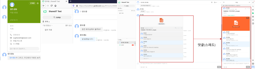 스레드의 경우 댓글이라는 명칭으로 메인 채팅화면에서 달 수 있으며 해당 스레드를 더블클릭하면 우측에 별도의 창이 마련되어 해당 공간에서 개별 스레드의 대화를 이어나갈 수 있습니다. 멤버들이 많을 경우 메인 대화창은 거기대로 대화가 이어지고, 스레드에 참여하는 사람은 그 사람들끼리 별도의 창에서 대화를 이어나가면 되니 꽤 좋아 보였습니다.