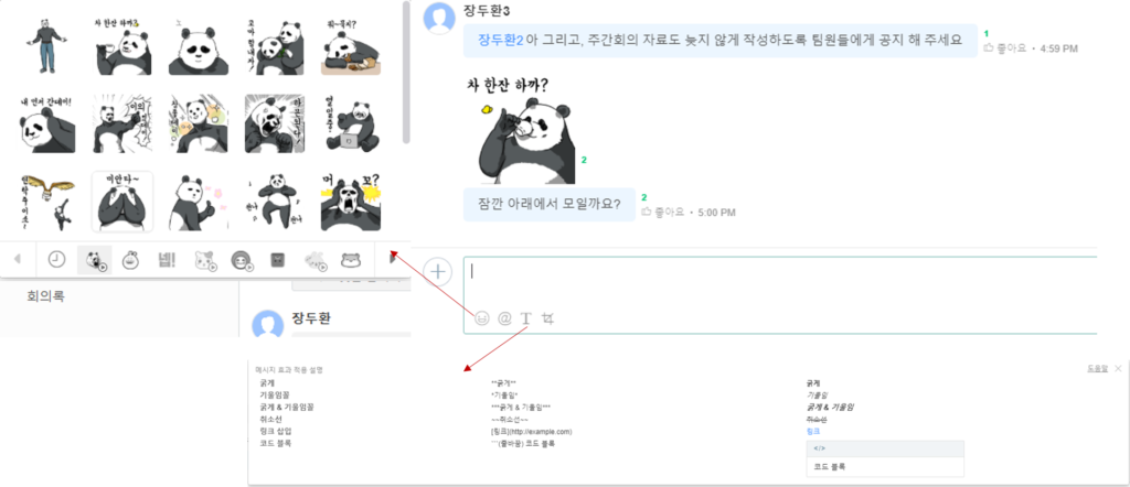 JANDI는 국산 솔루션 답게 한글로 된 재미난 스티커를 상당히 많이 제공하고 있었습니다. 인기 웹툰 캐릭터도 있었고요. 마치 카카오톡에서 사용하는 유로 이모티콘 기능을 보는 것 같았네요. 각 스티커 마다 한글로 코멘트가 달려있기 때문에 대화 없이 스티커 만으로도 대화가 가능할 정도죠.(실제 카카오톡에서 이렇게 대화하시는 분들 계시죠? 주로 묻는 말에 대답만 하는 아재들이 그런 성향을 보이는 것 같기도…저도 그런 경험 많거든요.)