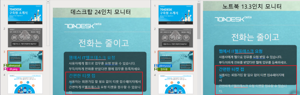 Microsoft Teams에서 PPT파일을 열면 폰트는 제대로 적용되어 있었으나 화면 크기에 따라 보여지는 줄바꿈에 문제가 좀 있었습니다. 좌측은 데스크탑 24인치 모니터, 우측은 노트북 13.3인치 모니터에서 열어본 미리보기 화면이고요. 빨간색 박스 안을 보시면 줄바꿈이 미묘하게 다릅니다. 이는 공동작업을 해야 하는 각자의 환경에 따라 서로 다른 화면을 보게 되기 때문에 PPT파일의 미세작업 시 오류가 생길 소지가 있으니 주의하여 작업하셔야 합니다. 이 현상은 Cisco Webex Teams에서도 동일하게 나타났습니다.(설마 같은 뷰어를…?)