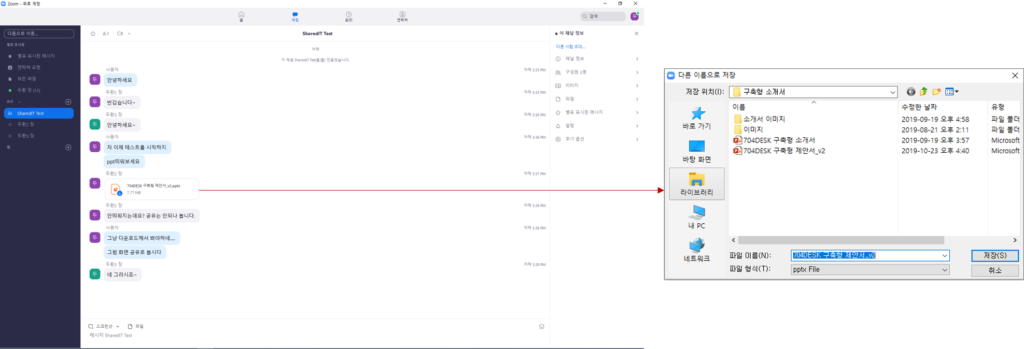 Zoom의 자료 공유는 말 그대로 자료 공유만 딱 제공하고 있습니다. 심지어 미리보기도 없더군요. 자료를 더블클릭하면 우측과 같이 다운로드 창이 나타납니다. 화상회의가 핵심인 솔루션이긴 하지만 미리보기 조차 제공하지 않는 것은 아쉽기만 합니다.