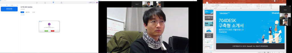 가장 우측은 화면공유 시 데스크탑에서 보여지는 화면이고요. 참석자들의 모습이 상단에 나타나고 좌측에 참여자 리스트가 보여지는 형태입니다. 화면 공유 시 딜레이는 많이 느껴지는 편이었는데 뒤에서 다시 말씀드릴게요.