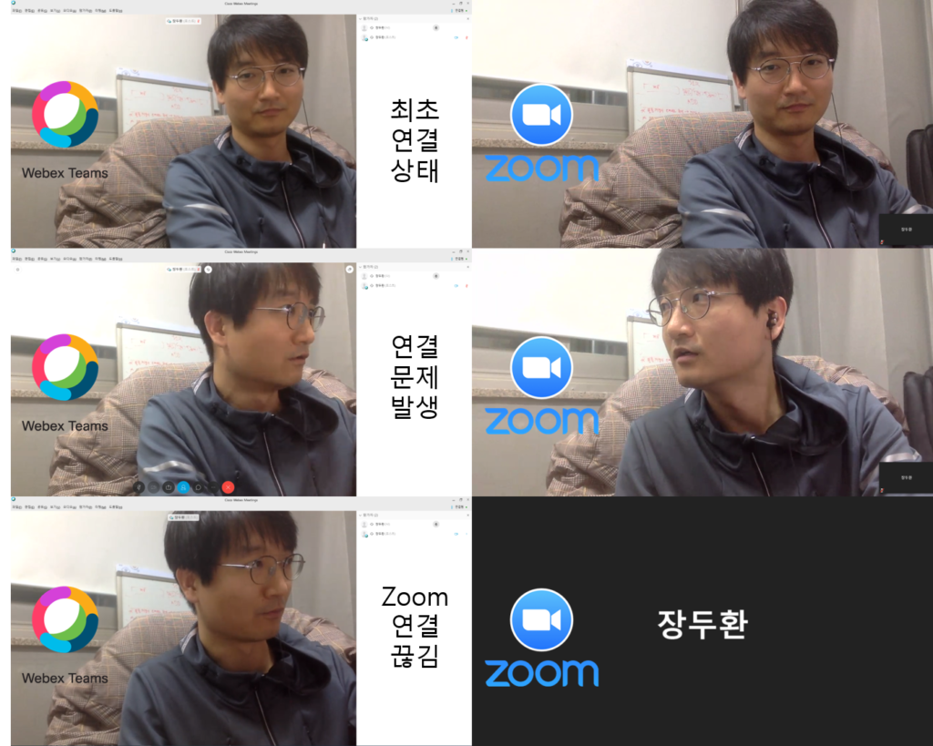 가장 위 이미지처럼 최초 연결 상태는 두 모습이 동일합니다. 화면 UI때문에 보여지는 화각이 다를 뿐 제 표정은 동일한 것을 확인하실 수 있는데요. 그 아래 연결 문제 발생 이미지를 보시면 Cisco 쪽은 연결에 문제가 있는 것을 인지한 표정이고 Zoom은 아무일 없었다는 듯한 표정이죠? 동시에 연결한 상태임에도 불구하고 두 솔루션이 보여주는 저의 모습이 다릅니다.