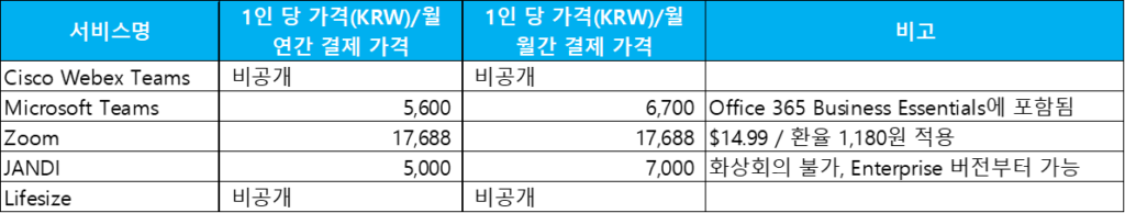 앞서 보여드린 협업 솔루션 5종의 가격을 비교 해 봤습니다. 아쉽게도 Cisco Webex Teams와 Lifesize는 가격이 공개되어있지 않았고요. Microsoft Teams는 Office 365를 사용하면 무료로 제공됩니다. 그래서 시작가격이 Office 365 Business Essentials가격과 동일한 1인당 월 5,600원입니다. Zoom은 1인당 월 $14.99fh 환율 1,180원을 적용하면 17,688원으로 18,000원 정도 됩니다. JANDI는 1인당 월 5,000원부터 시작인데 화상회의를 월 9,000원의 Enterprise 버전을 사용해야 합니다.
