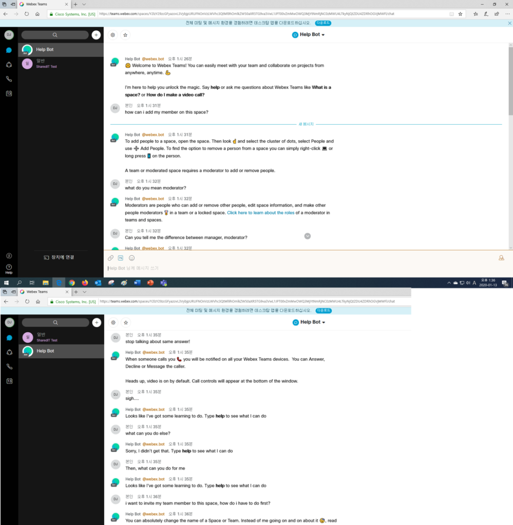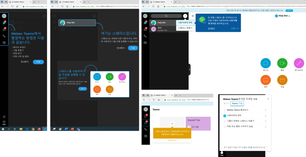 여기까지 클라이언트에 처음 접속했을 때 나타나는 사용자 가이드를 살펴 봤습니다. 저는 가장 자세한 가이드를 제공했던 Cisco Webex Teams에 제일 높은 점수를 주고 싶네요. 아무리 쉽고 잘 만들어진 솔루션이라도 처음 접하게 되면 어색하기 마련이라 가이드는 최대한 자세히 제공하는 것이 좋다고 생각합니다.