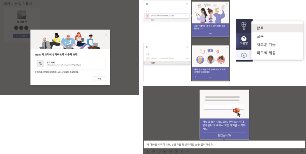 Microsoft Teams는 Office 365 고객이라면 사내 협업툴로 사용할 수 있는 솔루션입니다. Office 365를 사용하지 않더라도 사용은 가능하나 기능 및 기술지원 범위에 제한이 있습니다. Microsoft가 만든 솔루션답게 UI가 보기좋게 잘 다듬어져있고 일러스트가 꽤 이쁩니다. 사용자 가이드의 경우 Cisco Webex Teams와 마찬가지로 튜토리얼 형태로 제공되는데 양이 그렇게 많지는 않더군요. 대신 도움말을 클릭하면 제대로 사용해 보기 전에 학습할 수 있도록 상당히 많은 분량의 사용자 가이드 자료가 나타납니다.