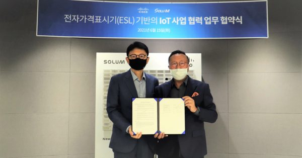 [2021년 6월 16일] – 시스코 시스템즈(www.cisco.kr, 이하 시스코)가 솔루엠과 함께 전자식 가격 표시기인 ESL (Electronic Shelf Label)을 지원하는 통합 솔루션 개발에 나선다. 이를 위해 양사는 6월 15일 서울 삼성동에 위치한 시스코코리아 본사에서 사업 협력을 위한 업무 협약(MoU)을 체결했다.