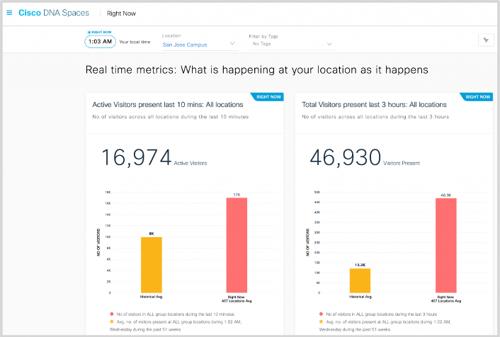DNA Spaces Right Now는 현재 시설을 사용하는 인원을 보여줍니다.