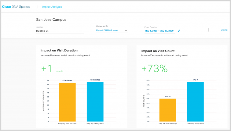 시간이 지남에 따라 사무실 복귀 제도가 확립되면 기업에서는 사무 공간의 새로운 사용 패턴과 경제성을 평가해야 할 것입니다. DNA Spaces의 Impact Analysis 앱을 사용하면 기업 내 시설 관리자는 건물과 캠퍼스가 사용되는 수준뿐만 아니라 그 양상까지 알 수 있습니다. 사무실에서 보내는 시간, 건물 사용률, 업무 공간 재구성에 도움이 되는 기타 지표에 대한 보고서를 제공할 수 있게 됩니다. 이런 도구는 상가, 학교와 같이 방문자와 손님이 많은 건물에 특히 중요하다고 생각합니다.