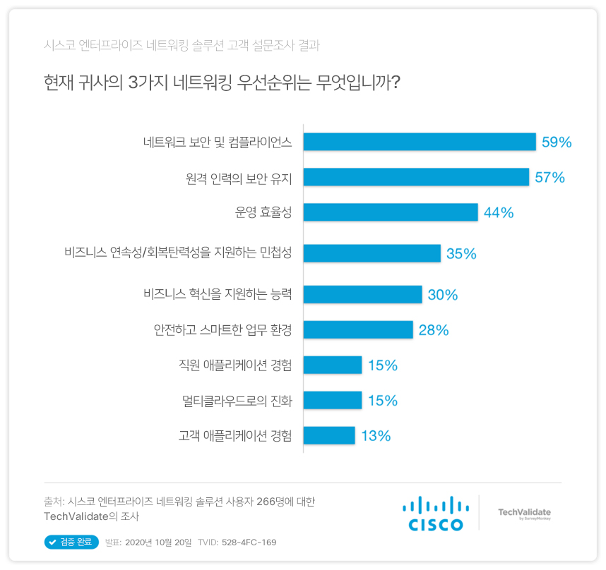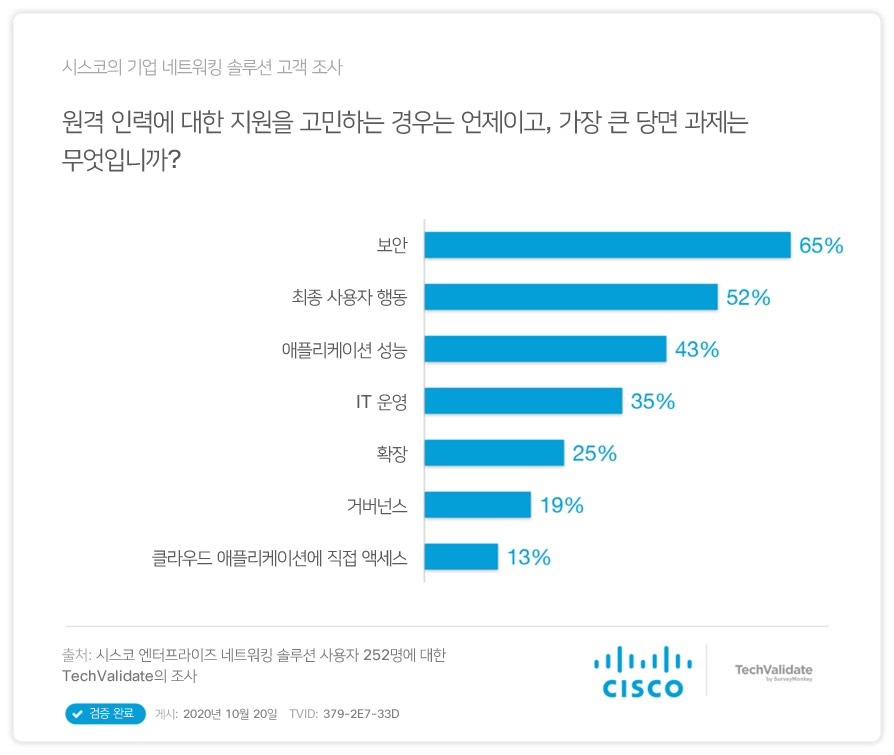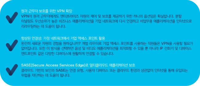 여기에서 다음과 같은 질문이 떠오릅니다. 기업 네트워크에 대한 생각을 바꿔야 할 때가 온 건 아닐까요? 회사 측에서 사무실 근무를 요구하는지의 여부를 떠나, 직원들은 최소한 일정 시간 동안은 원격 근무가 필요하다고 생각할 가능성이 높습니다. 비즈니스 회복탄력성 관점에서도 코로나19 팬데믹 같은 중대 사건이 다시 발생하는 경우에 대비하여 사용자가 어디서나 엔터프라이즈 네트워크를 이용할 수 있도록 안전하게 확장할 수 있는 기능이 필요합니다.