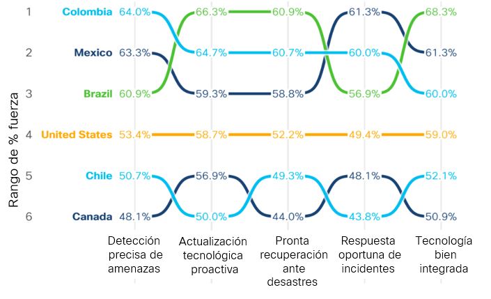 Entonces, ¿cómo calificaron los países de las Américas su implementación de estas prácticas “Las Fabulosas 5”? Si miramos a Colombia, por ejemplo, el 64 % de las organizaciones dice que sus capacidades para la detección precisa de amenazas son sólidas, mientras que solo el 48,1 % de las organizaciones canadienses dice lo mismo. Hay mucho movimiento en torno a los tres primeros países: Colombia, México y Brasil. Estados Unidos ocupa el cuarto lugar de manera constante en todos los ámbitos.