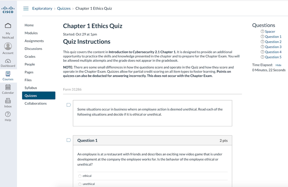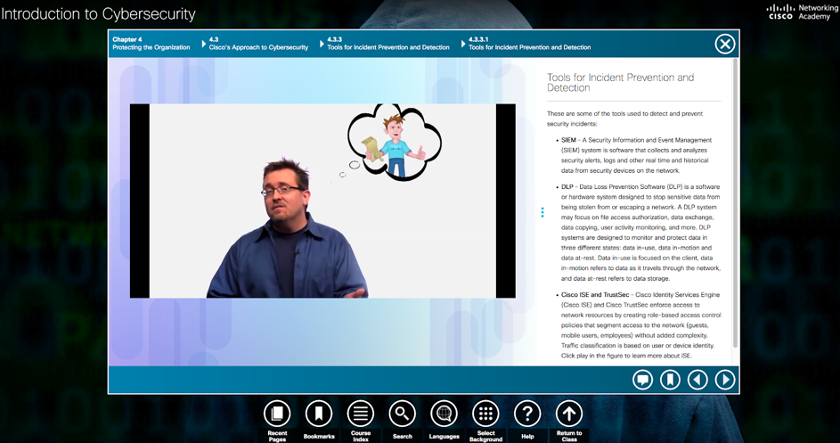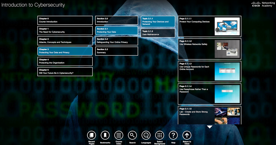 For bedre å forstå hvordan modulene fungerer har jeg plukket ut “Introduction to CyberSecurity” som et eksempel. En student vil logge inn på Netacad.com etter at lærer har registret de og delegert modulen til studenten. Studenten vil kun se de moduler som lærer har gitt de tilgang til. Ved å velge “Introduction to CyberSecurity” fra sin meny av kurs vil den laste i nettleseren. Lærer kan følge progresjonen til studentene.