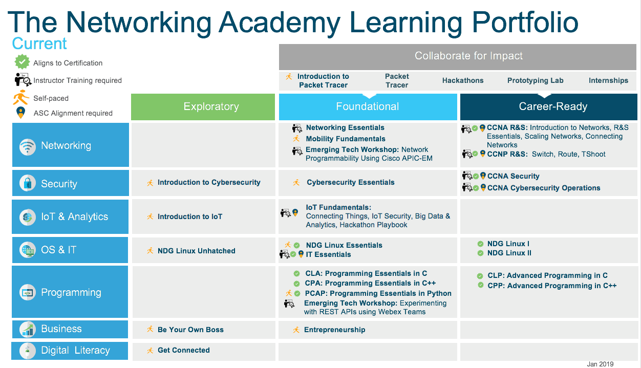 Studentene som var med å designe, bygge og vedlikeholde skolens datanettverk, tilegnet seg ferdigheter som førte til at det ble utviklet en bransjesertifisering. Cisco støttet det nye programmet, noe som resulterte i utviklingen av Cisco Certified Network Associate (CCNA) pensum. Planer for å tilby flere kurs fikk støtte og fart, og opprettelsen av IT Essentials, CCNA Security og Cisco Certified Network Professional (CCNP) var resultatet. Pensum for disse sertifiseringene ble lært bort via Netacad-plattformen.