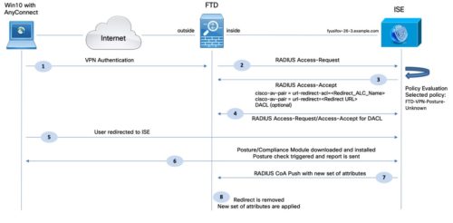 The results of the posture validation (Compliant or Non-Compliant) are then sent to ISE, that will apply the proper Authorization Policy result. If the machine is deemed “complaint”, then the ISE can send a RADIUS CoA (Change of Authorization) to the FTD with the new set of authorization policies. After successful posture validation and CoA, the user is allowed access to internal resources.