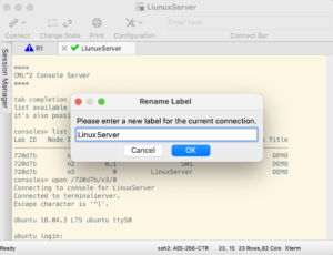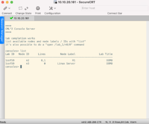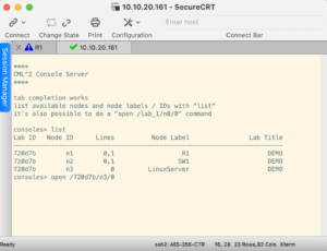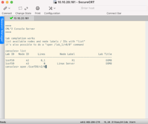 - To access the devices type: open /<Lab ID>/<Node ID>/<ConsoleLine>. Example: open /1cef59/n2/0
