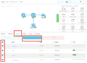 - To save the topology and the configuration of the devices, click on the node tab, select all the devices and click on “Extract Configs for Selected”: