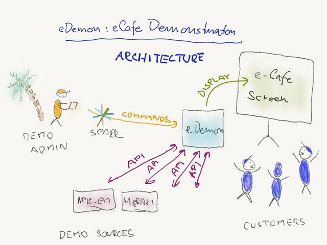So what was the project we build? In most Cisco offices there is a public area called eCafe. As the name suggests, there is a nice coffee machine, as well as the electronic “e” element in form and shape of live product demonstrations and impressive large screens. Every customer has specific preferences and we want to make their experience as relevant and enjoyable as possible. Hence we built an automated system, which enables us to switch between different demos and contexts instantly.