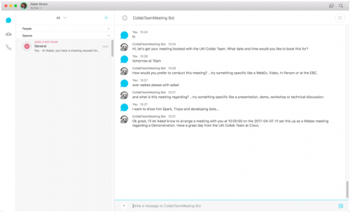 Not only does the bot inform the user and I that a meeting is being requested, something special happens: it automatically creates a calendar invite and sends it to us both to accept. The bot populates the calendar invitation with all the necessary information for us to communicate at the time of the meeting, using Cisco WebEx or even Cisco Video Conferencing – improving productivity and our meeting experience. Bingo.